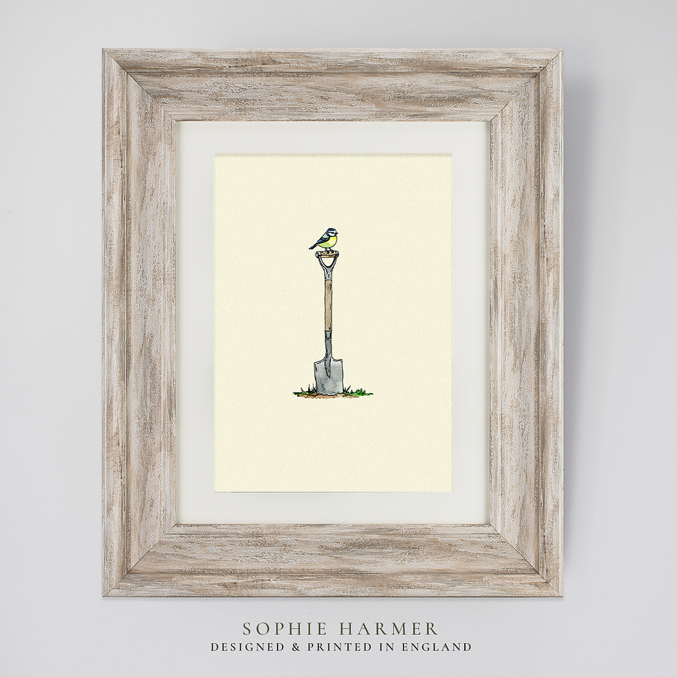 A quiet nod to British garden life, this delicate illustration features a blue tit perched gently atop a well-used garden spade. With Sophie’s signature fine linework and soft watercolour tones, the design captures the stillness of an early morning in the garden.
